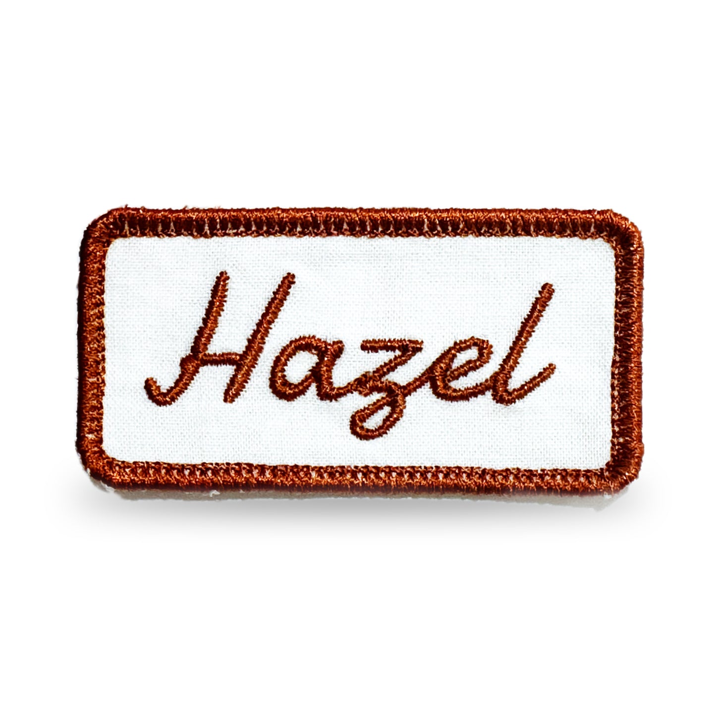 This is a customizable name patch with embroidered borders and text. The patch is rectangle-shaped, and is embroidered on a white cotton background. The embroidery itself is stitched with hazel rayon/polyester thread. You can customize the text and font of this patch.